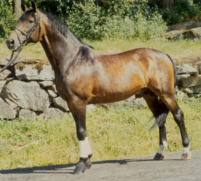 | Arvostelu: | Suurilinjainen, jalo ja sopusuhtainen. Kaunis pää, pitkä, ryhdikäs kaula, hyvinkehittynyt säkä, syvä runko ja pitkä lautanen. Hieman pysty lapa. Hyväjalkainen, leveät nivelet. Melko säännölliset liikkeet, levittää hieman takaa. Matkaavoittavat liikkeet käynnissä ja ravissa, tahdikas ravi, jossa hyvä takaosan työntö ja elastisuus. |